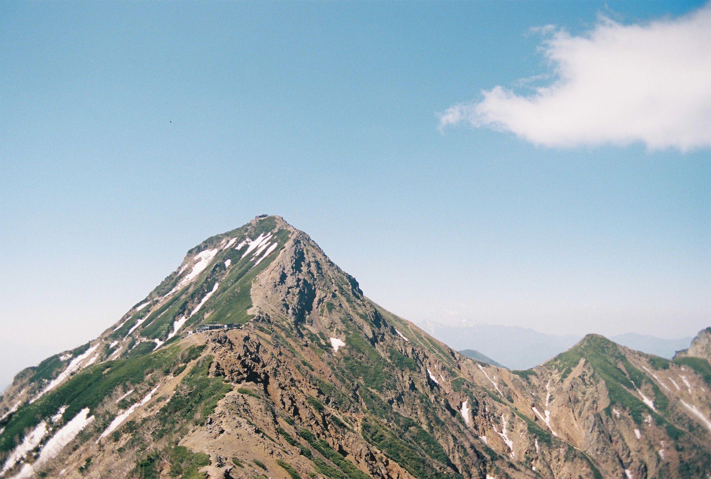 Climbing in wonderful solitude up the gentle slope towards Neishi-dake, I noticed the smell of pine sap in the air as the sun warmed the trees, which gladly released their fragrance in response. Further up the slope the path was occasionally blocked by mounds of lingering snow. Nothing too hard to work with but still surprising. Neishi-dake was one of the smaller bumps in the ridge line (though still well over 2600 metres in height). It didn’t take me too long to summit, where I had a brief chat with an elderly couple who were excited to find a foreigner hiking the Yatsugatake traverse. Apparently we all go to the Northern Alps. I believe it.